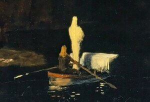 島に近付く船には棺が置かれており、